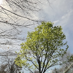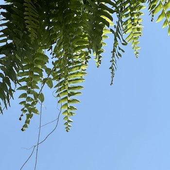 Today, it is sunny. A few little whispy clouds drift lazily across the sky. The sun peeks through the cheery leaves on the hanging ferns perched around my table.